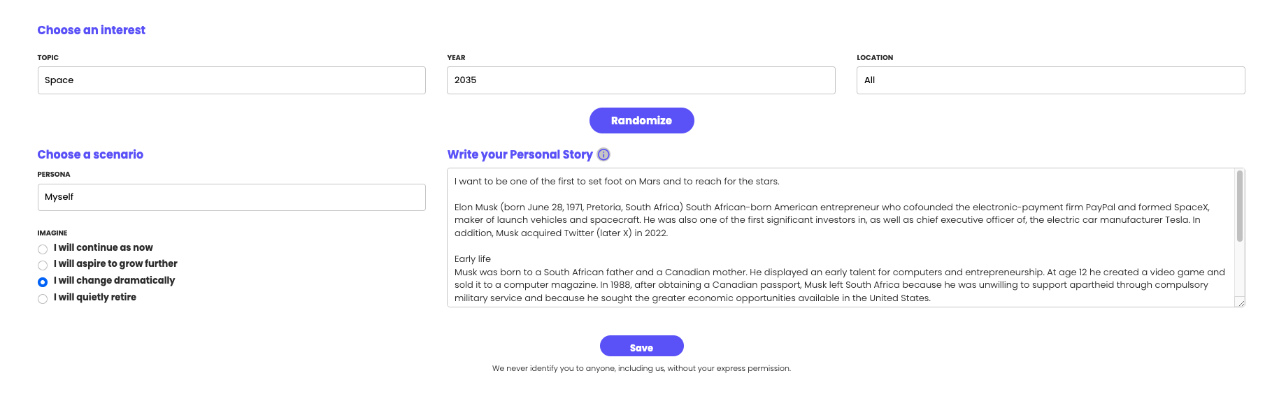 Image 2: Example input for the 'Write your Personal Story' textbox. -