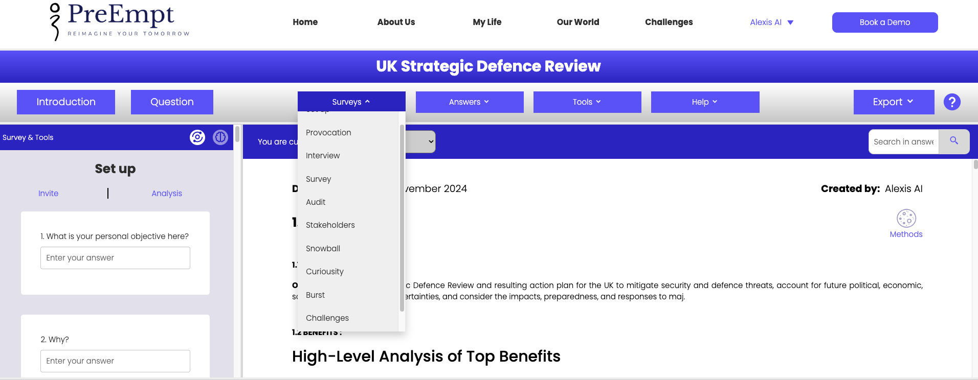 When you Ask a Question, Alexis responds with her initial Answer. You, and others, can then choose among common Surveys and Tools to guide her subsequent responses as follows: